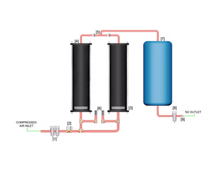 Air from an external source enters the generator via a 0.01-micron filter [1] that removes contaminants and bulk moisture via an integrated auto drain. When the control system assesses that more nitrogen is required, the solenoid valve [2] is opened and pressure is allowed to build in the column [4] containing Carbon Molecular Sieve (CMS) and a residue moisture catcher [3].This sieve adsorbs the oxygen and leaves the dry nitrogen free to flow through the non-return valve into the direction of the variable reservoir capacity (VRC) [7] Following on from this the Nitrogen is allowed to flow to the application via another 0.01 -micron filter [8] and pressure and flow regulators [9].The trapped oxygen is meanwhile filtered out through the exhaust valves [6]