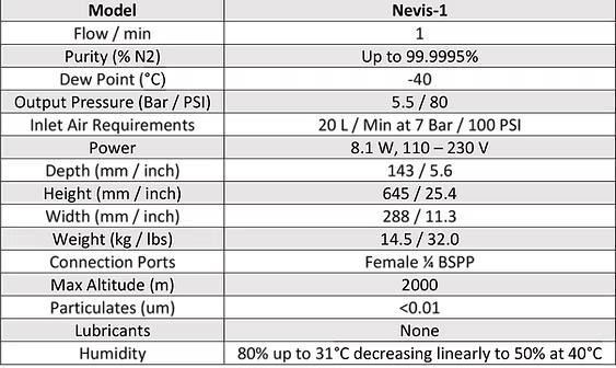 The Nevis Range is a flexible and expandable state-of-the-art product that simply produces nitrogen when you want it. The Nevis Nitrogen Generator is a discrete, efficient, modular system that produces ultra-high purity nitrogen only when you need it. The Nevis series uses PSA technology for superior performance and reliability. A range of models, including options for built-in compressors, is available to cover a wide range of applications. The larger units are fitted with castors to allow them to be manoeuvred easily into position. Most models in the series will fit under a workbench.