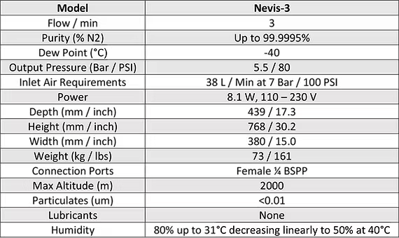 Apex`s Range of Ultra High Purity Nitrogen Generators. The Nevis Range is a flexible and expandable state-of-the-art product that simply produces nitrogen when you want it. Utilising Pressure Swing Adsorption technology the Apex Nevis series provides ideal performance, efficiency and reliability. High purity nitrogen is delivered as and when required. All models in the range are mobile to allow easy repositioning and installation. The Nevis series provides flexibility to match your system requirements. We can customise the purity, flow rate and delivery pressure to suit your specifications.