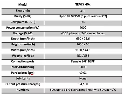 Largest Ultra-Purity Nitrogen Generator, Perfect for Any Lab. The Nevis 40C NitroGenerator is a flexible state-of-the-art Nitrogen Generator that produces flows up to 40 l/min and simply produces nitrogen when you want it. The Nevis 40C NitroGenerator is a discrete, efficient, modular system that produces high purity nitrogen only when you need it. The Nevis series uses PSA technology for superior performance and reliability. This model, complete with built-in compressors, is suited to covering a wide range of applications. When selecting a system, consideration should be given to the required flow rate, purity and delivery pressure. This larger unit is fitted with castors to allow it to be manoeuvred easily into position.