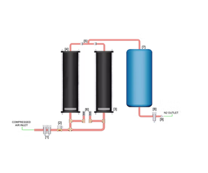 Air from an external source enters the generator via a 0.01-micron filter [1] that removes contaminants and bulk moisture via an integrated auto drain. When the control system assesses that more nitrogen is required, the solenoid valve [2] is opened and pressure is allowed to build in the column [4] containing Carbon Molecular Sieve (CMS) and a residue moisture catcher [3].This sieve adsorbs the oxygen and leaves the dry nitrogen free to flow through the non-return valve into the direction of the variable reservoir capacity (VRC) [7] Following on from this the Nitrogen is allowed to flow to the application via another 0.01-micron filter [8] and pressure and flow regulators [9].The trapped oxygen is meanwhile filtered out through the exhaust valves [6]