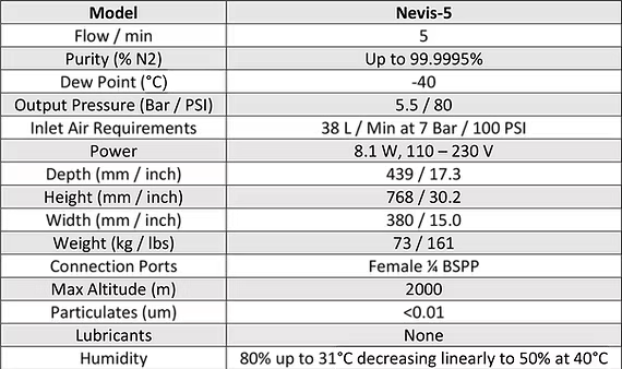 Apex`s Range of Ultra High Purity Nitrogen Generators. The Nevis Range is a flexible and expandable state-of-the-art product that simply produces nitrogen when you want it. Utilising Pressure Swing Adsorption technology the Apex Nevis series provides ideal performance, efficiency and reliability. High purity nitrogen is delivered as and when required. All models in the range are mobile to allow easy repositioning and installation. The Nevis series provides flexibility to match your system requirements. We can customise the purity, flow rate and delivery pressure to suit your specifications.