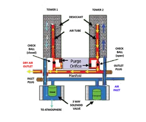 The dry air exits the machine via an outlet filter and regulator. A small amount of dry air is used to prepare the second scrubber tower for use. The unit switches which scrubber tower is being used at regular intervals