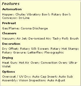 Any decoration technology can be integrated into the C-500. For multi-color applications, we suggest a dry offset print station. This can be supplied in different widths and with up to six color heads. For single color or overcoating applications we suggest the use of rotary silkscreening, rotary hot stamping, letterflex, or flexographic printing, with each type specifically designed and interfaced to suit your own specific requirements.