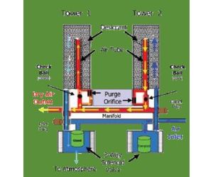Air from an external source enters the generator via the inlet filters. Air then enter the first scrubber tower via a solenoid valve. After passing through the dryer tower the now dry air exits the system via an outlet filter and regulator. A portion of the outlet air is diverted into the second scrubber tower to purge it ready for use. At regular intervals the active tower switches allowing each tower to be purged in turn.