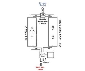 Air from an external source enters the generator via the inlet filters. Air then enter the first scrubber tower via a solenoid valve. After passing through the scrubber tower the now dry and CO2 free air exits the system via an outlet filter and regulator. A portion of the outlet air is diverted into the second scrubber tower to purge it ready for use. At regular intervals the active tower switches allowing each tower to be purged in turn.