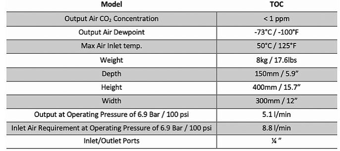 Using regenerative Pressure Swing Adsorption (PSA) technology our TOC generator provides ideal performance, efficiency and reliability. Ultra dry air containing less than 1ppm of CO2 and free of TOC (Total Organic Carbons). The generator is mounted in its own enclosure that allows it to be easily wall or stand mounted. Delivering up to 5 litres/minute of TOC free air the TOC generator is ideal for supporting small scale applications. A TOC generator provides a lower power solution and offers a single integrated air treatment option that also removes carbon dioxide and moisture from compressed air. Each unit is supplied with an integral buffer tank to even out the airflow and includes a full particulate filtration system that removes particles down to 0.01µm in size. An external regulator is also supplied.