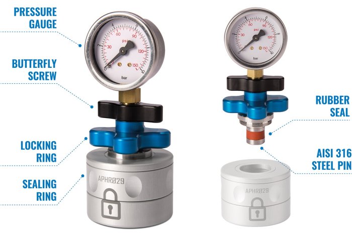 This tool constantly measures the pressure inside the bottle. The main innovation to this product is the patented anti-eject security system, a locking/unlocking mechanism which protects the operator’s safety.