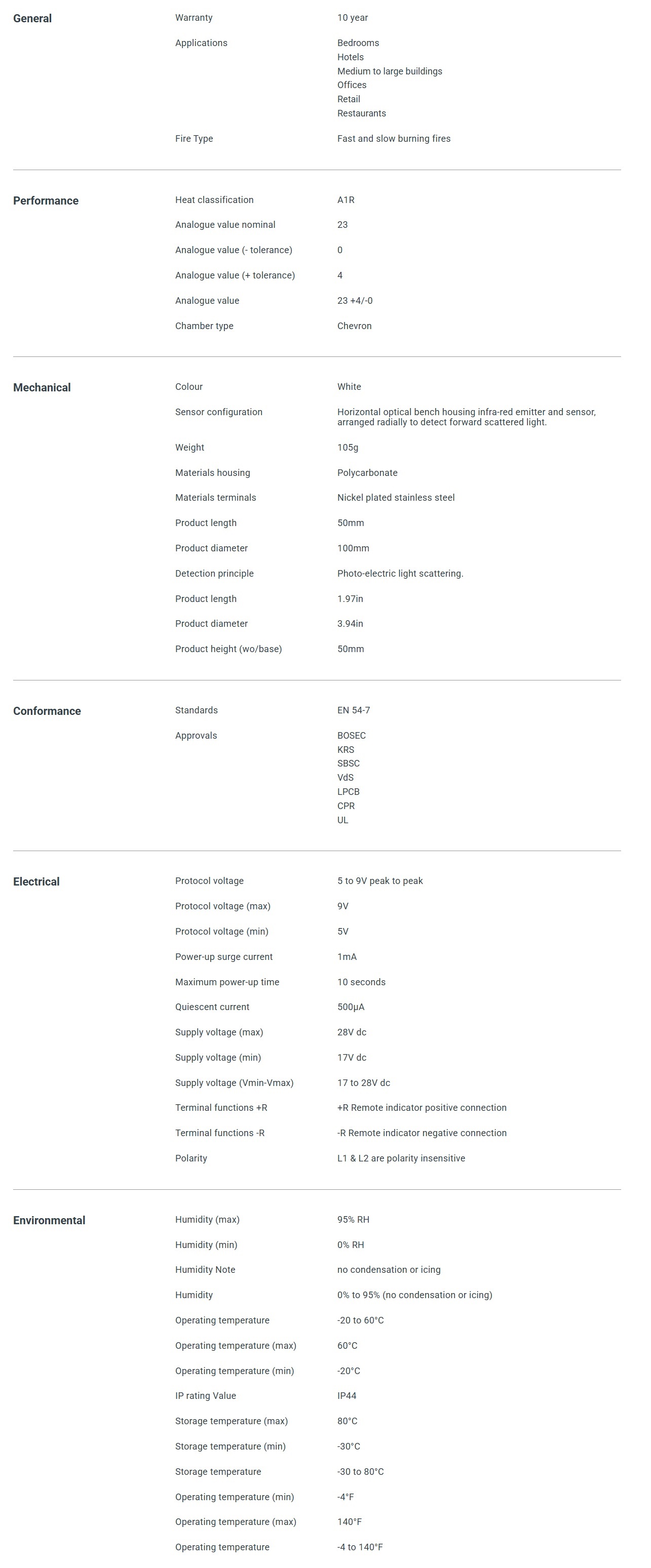 The XP95 Multi-Sensor Detector combines independent optical smoke and temperature sensors for better fire detection in areas with deceptive phenomena. Reliable fire detection in areas with a wide temperature range from -20°C to +60°C. Well suited to environments such as hotel bedrooms, warehouses and loading docks. Unaffected by wind and atmospheric pressure. Alternative to Ionisation detectors.