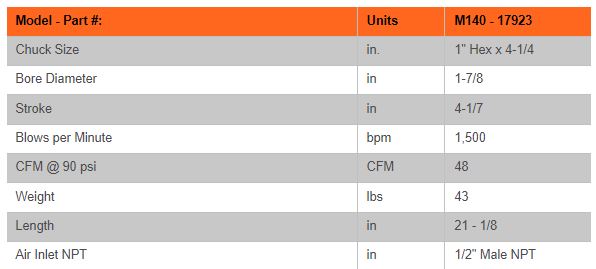 The APT M140 is a rugged, yet lightweight Paving Breaker designed for light to medium construction work. It is ideally suited for plant maintenance, such as light demolition of floors, pavements, and frozen grounds. This tool is also very popular for bridge deck jobs.