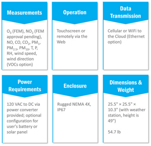 The Best of the Best in One Package: The AQSync Air Quality Monitoring Station. FEM-quality absorbance measurements for O3, NO2, and NO. NDIR absorbance for CO2. Optical particle counter with sheath flow and heated inlet for PM1, PM2.5, and PM10. Amperometry for CO. Sonic anemometry and weather data. Data access and instrument control via the Cloud. Power-stingy requirements enable options for powering with battery or solar panel.