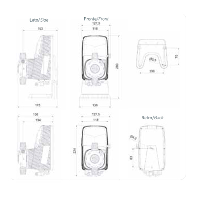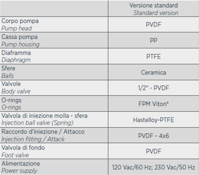 Digital multifunction solenoid driven dosing pump. Constant or proportional dosing setting. Reinforced PP housing, suitable for harsh working environments. Inputs: level probe, inhibit, proximity sensor. Power supply 100 – 240Vac, 50/60Hz. Selectable language and units of measurement. 132×56 pixel graphical display. Simplified menu access via knob / encoder. IP rating IP65. Wall mounting bracket supplied with installation kit.