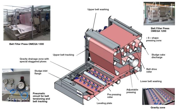 The OMEGA press consists of a stainless structural frame, sludge inlet and distribution assembly, long gravity thickening zone, adjustable medium pressure section, high pressure "S" shape zone, variable speed drive, continuous belt washwater section, automatic belt tracking and automatic belt tensioning systems, filtrate collection pans, internal wiring and piping, electric control panel (optional).