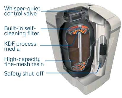 - Patented design packs more softening power into a small space using less water, less salt and less time