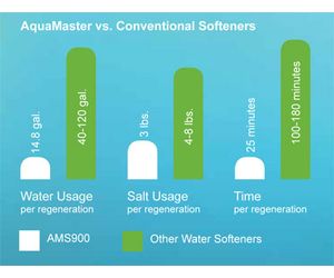 - AquamMaster high-efficiency water softeners use 80% less water than conventional softeners for the same hardness removed.