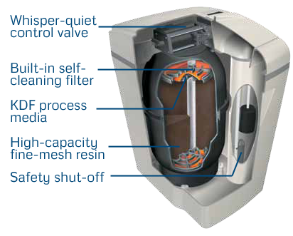 High Efficiency Water Softener and Chlorine-Removal System, all-in-one. Unparalleled convenience, efficiency and innovation. Whole-home filtration system for city water. Reduces chlorine taste and odor. Softens up to 35 grains hardness per gallon. Built-in 20-micron self-cleaning filter. Built-in KDF Max and carbon filtration. Regenerates in just 20 minutes, only when required (on demand). Uses as little as 15.1 gallons of water and only 2.5 lbs of salt to regenerate (to remove 10,400 grains of hardness).