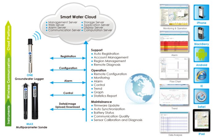- AQWEB WEB Server software for configuration, automatic data acquisition and storage, remote monitoring, alarming, control, Google Earth fusion display, data analysis, transient pressure analysis, time series trend graph andtabular report functions