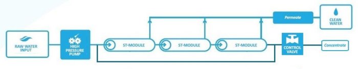 Like traditional spiral wound modules, the feed flows over the membrane parallel to the individual membrane leaves from which the spiral is constructed. Hence, ST modules are operated in series, up to 6 in a single pass. Multiple parallel passes will provide greater permeate flow in a single stage. Separate passes of membranes in a second stage will allow for additional concentration or permeate treatment as desired.