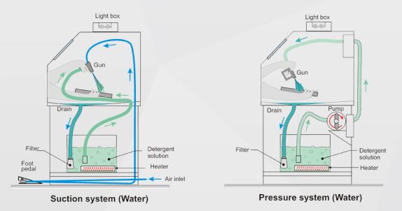 Contrary to pressure jet systems, suction-type vaporization systems operate using the Venturi principle, sucking fluid from cleaning accessories. Liquid output in wide-spray jet covers large section of part that needs cleaning, with air added to dislodge hard-to-remove oil and grease. Cleaning accessories activated with foot treadle.