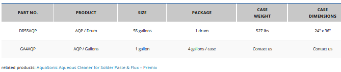 Certified Clean Air Solvent by the South Coast Air Quality Management District (SCAQMD). GlobalTech AquaSonic Aqueous Cleaner for Solder Paste & Flux (AQP) is more than 90% water based with all ingredients being 100% active. It has been specifically formulated, using a proprietary electro-chemistry technology, to remove solder paste and flux residue in critical cleaning applications. Electro-chemistry Technology: Works by reversing the normal polarity of a contaminant causing the like charges of the contaminant and the work surface to repel each other, thereby preventing reattachment to the surface. Contaminants are suspended from the substrate and are washed away, leaving a clean, shiny, water break-free surface. It works at a sub-molecular level to penetrate crevices and orifices to dislodge microscopic contaminants. This technology drastically improves the cleaning efficiency by minimizing the amount of rinse water needed.