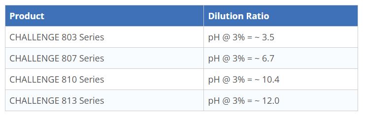 It is recommended that evaluations of CHALLENGE 800 Series Products begin at a dilution of 3% mixed with deionized (DI) water. Tap water that does not contain hard water ions is also acceptable.