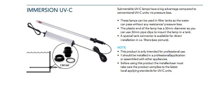 The 75 watt UV lamp provides two important functions. Function 1 is the eradication of algae. The UV penetration inside the RDF is more effective than inside traditional tubes. The 75 watt UV lamp is capable of servicing a 20000 gallon pond and has a two year use life. Function 2 is the eradication and prevention of bacterial growth on the drum screen. Bacterial growth on an RDF screen can interfere with its normal operation. Utilizing the UV does away with the need to clean the screen with chemicals, like acid.