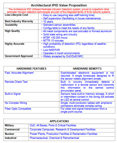 The Architectural IPID system provides a reliable security barrier of pulsed infrared technology to create multiple detection zones, each with a range of up to 300 feet. Our solid state electronics are not affected by environmental conditions such as birds, small animals, snow, puddles, leaves, grass or mechanical vibrations. It works in rain, snow and fog instantly pinpointing the intrusion zone via normally opened or closed dry contacts that can be interfaced with any annunciator or data communication system. IPID does not false alarm. The system will only alarm if an object breaks the 3.54" diameter beam more than 98.5%.