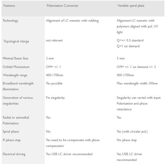 - Available topological charges (fixed during manufacturing) : q=0,5 standard, q=1 and higher on demand
