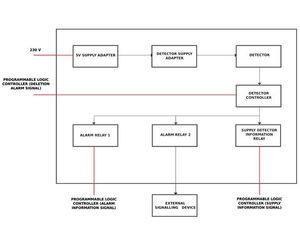 Relay alarm which is the part of the monitor, enables the management of the external device in case of exceeding the default alarm threshold (door closing, turning on the optic - acoustic external signalling device or ventilation system).
