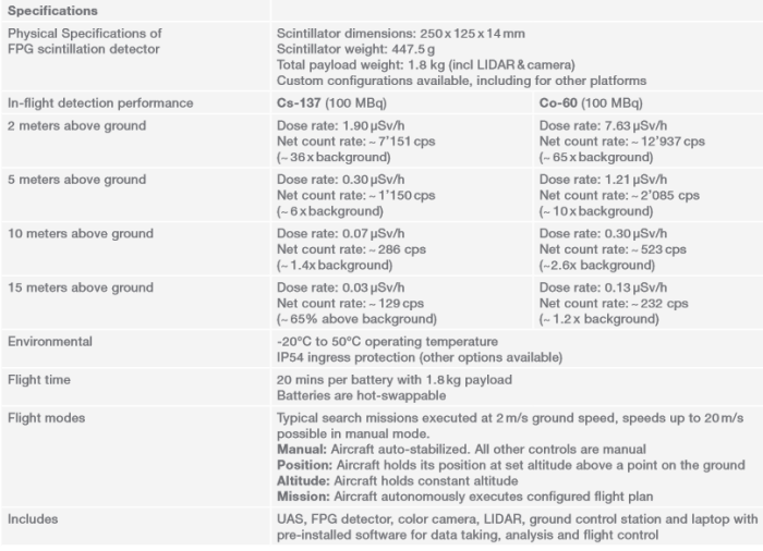 Flying a tight search pattern, it can map radiation at speeds of 2 m/s. Equipped with a large area Flat Panel Gamma (FPG)