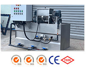 Polymer Dosing System is a compact unit that automatically feeds the process, as needed, using a regulated ultrasonic level switch. Unit has treee comparments. The first one is preparation compart- ment, the second one is ageing department and the last one is storage compartment. These three parts are seperated from easch orher by welded plates. Polymer Storage and feeding hooper is a steel small tank in which polyelectrolyte is stored. Polyelectrolyte in this hoop- er doses by the mounted feeding screw bottom of the hooper. There are two mixers in the unit. In the first compartment, there is a rapid mixer used for polyelectrolyte prepration and in the second compartment, slow mixer for ageing. Units can be manufactured in different capacities depending on the requirements.