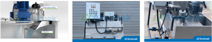 We produce “Polyelectrolyte Preparation Units”, which are one of our areas of specialization, in short-time, with wide capacity range and various material choices. The automatic polyelectrolyte preparation and dosing unit consists of a rectangular tank divided into three compartments