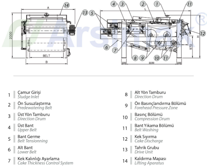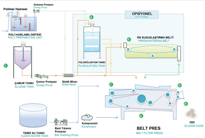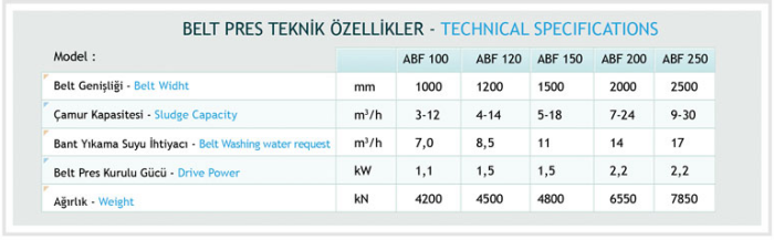 With its continuously working system, low energy consumption and high capacity characteristics, Belt Press is a broadly applicable product preferred for Municipal and Industrial Zones waste treatment facilities. Belt Presses are high capacity equipments performing dewatering by using pressure-resistant belts for the drum compression pressure. Belt Presses can be operated uninterruptedly and display low energy costs.