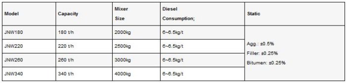 - Patent "synchronized decrement" weighing method, eliminating the weighing error caused by the “flash materials”; dynamic weighing accuracy: aggregate and filler<1%, bitumen<0.8%; static weighing accuracy: aggregate±0.5%, filler and bitumen±0.25%;