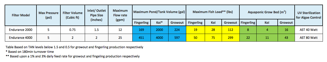 AST Endurance filters are ideal for ponds or tanks 200 to 4000 gallons in size and are designed for use in KOI, Aquaponic, Fingerling and small Growout applications. The tables below shows the approximate sizes of ponds, tanks and aquaponic systems the Endurance models will support.