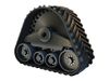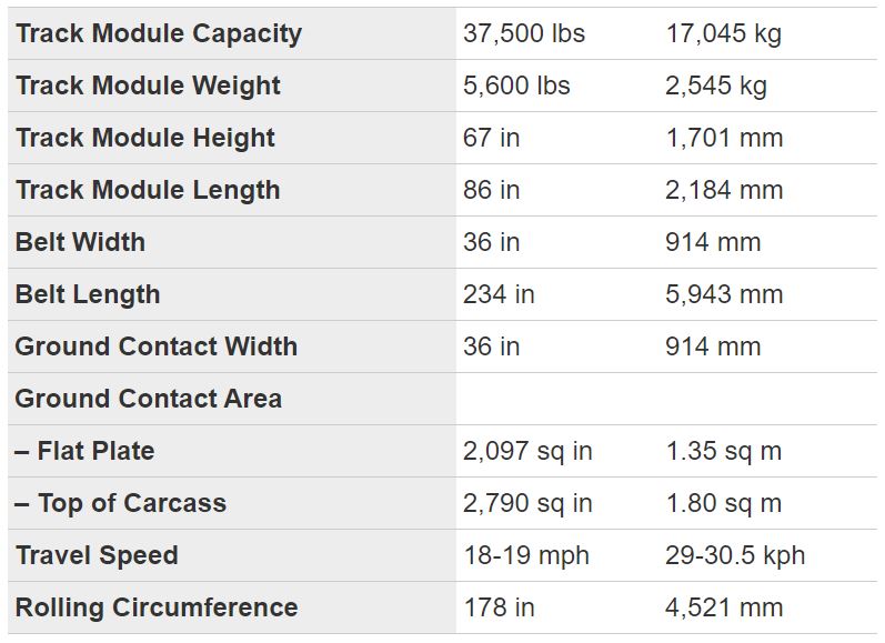Rugged, durable performance. All-sealed, no-grease fittings. Large diameter drive wheel for increased belt life and speeds similar to a wheeled vehicle. Narrower width than dual wheels. Large footprint reduces slippage and compaction.