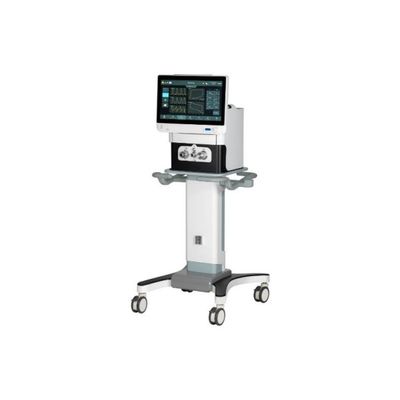 The 18.5 inch touch screen features all the parameters of the patient’s exhalation with the wave form. The device is equipped with an electronic power supply that connects to the mains power and also is able to work with the battery as an alternative. Setting up the pneumatic parts is done by connecting to the supplemental Oxygen and Air.