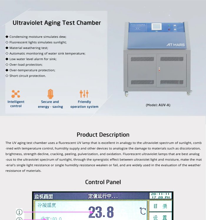 Ultraviolet Aging Test Chamber simulates the damaging effects of long-term outdoor exposure of materials and coatings by exposing test samples to varying conditions of the most aggressive components of weathering – ultraviolet radiation, moisture and heat. Ultraviolet Aging Test Chamber uses fluorescent lamps to provide a radiation spectrum centered in the ultraviolet wavelengths. Moisture is provided by forced condensation, and the temperature is controlled by heaters.