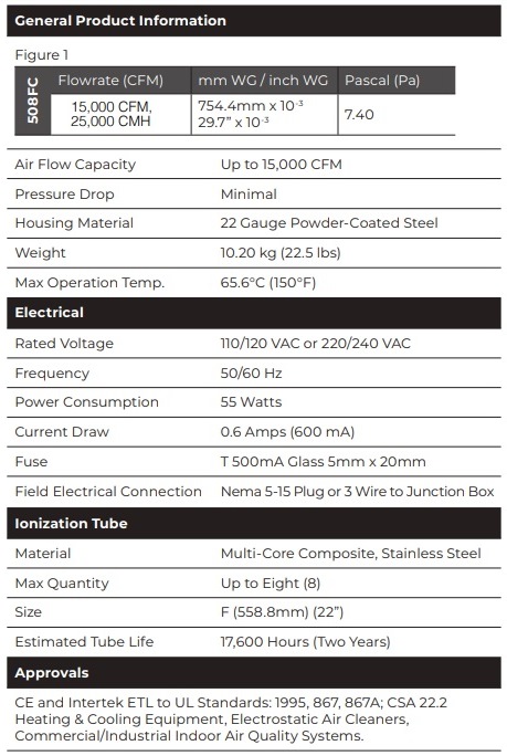 he AtmosAir 508FC ionization system is designed to be mounted in the supply air duct or air handling system of a heating, cooling or ventilation system. The unit produces bi-polar ions when airflow is delivered over the ion tubes. Power to the unit can be controlled with an optional air pressure differential switch or interlocked with HVAC fan operation, provided the power delivered to the unit does not exceed its rated voltage. Ionization intensity can be adjusted with a five-step knob on the unit. Power to the unit can be turned off at the unit or a quick disconnect at the power cord.