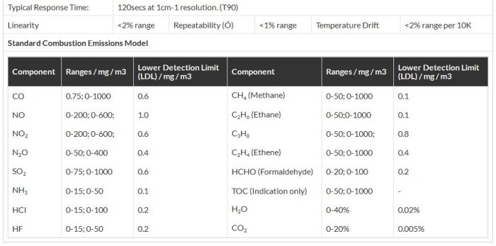 The standard incineration emissions application includes the following gases and ranges.