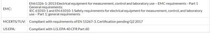 - Meets the requirements of EN 15267-3, QAL1 and EN14181. Certification due Q2 2017