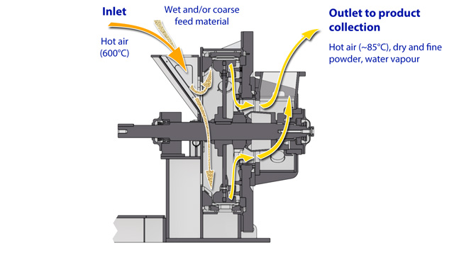 The Atritor Dryer-Pulveriser has been in continuous manufacture for over 80 years. It has a unique design with pulverising occurring predominantly by attrition. The mill is a very compact air-swept flash dryer and temperature differentials of over 500°C ensure high evaporative capacity and thermal efficiency.