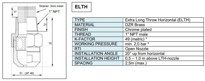 To overcome this challenge GW offers a solution using two specialized nozzles in combination to provide horizontal spray coverage up to 13m from the wall. If fitted on opposite walls, the GW DD-LTH+ELTH combination can protect open spaces up to 26m diameter/ wall-to-wall distance.