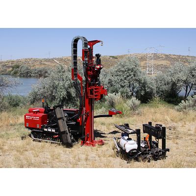 The New 9580-VTR PowerProbe™ is powered by a tier 4, 60 HP John Deere liquid-cooled diesel engine, and has an increased diesel fuel storage to 30 gallons. The new auger and hammer system has hydraulic pivot and locking systems, and the hammer, auger motor, winch, and auto-drop can all be positioned over the same borehole without realigning or repositioning the machine. The new auto-drop hammer has improved hammering capability and functionality, and the new 3,000 lb. hydraulic hi-speed winch requires less operator attention. The rig also features a stronger mast with a larger foot for increased stability, and has a more compact height and width – as well as a fully equipped weight under 12,000 lbs with a lower center of gravity. We have added a new hydraulic tooling rack with increased rod carrying capacity, a multi-functioning dozer blade, an all new control panel that allows you to run everything from a single position.