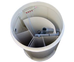 The wastewater treatment plant consists of a polypropylene reactor with an inner built-in technological structure. The maximum achievable purification effect is based on the utilisation of low-load activation technology with aerobic sludge stabilisation. The AT wastewater treatment plant is covered with a removable, lockable PP cover. The plant uses a tried and tested system of continual biological purification of wastewater with an integrated accumulation of abruptly inflowing water. This technology is protected internationally by patent No. EP1919833. Our purification technology ensures the high quality of treated water as well as low investment and operating costs. The technology is also known under the international name of Vertical Flow Labyrinth - VFL.