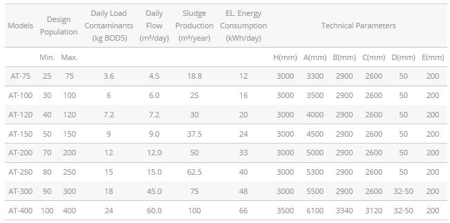The treatment unit includes an air blower mounted next to the plant.The shape, configuration, arrangement of treatment stages and equipment of bio-reactors installed are analogous to all AT-75 – AT-400 models. Along with the increase in the capacity of bio-reactors, so is the corresponding structural parameters of the equipment.