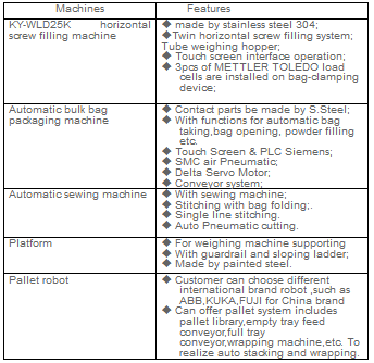 KYZD-F system auto powder bulk bag packing machine is developed specifically for 10~50kg heavy bag of powder products which own good mobility or mixture powder. This machine can realize automatic weighing,bag-feeding, filling, bag-conveying, sealing/sewing, etc.