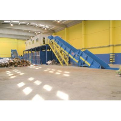 Co-mingled waste Sorting and Picking system, Multiple storage bunkers with automtic and manual discharge onto the Autobaler feed conveyor.