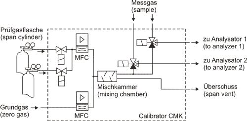 The calibration system serves the mandatory zero and end point verification of gas analyzers, especially those in automated measuring networks. The zero and end points are verified with a signal from the measuring network computer; the calibration can also be activated with the keyboard at the front of the CMK.