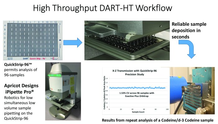 The DART-HT enables the use of automated liquid handlers to deposit directly onto the new QuickStrip-96 consumable allowing integration of the device into the laboratory workflow and sample informatics. Sample deposited onto each of the discrete screen positions analyzed by moving the screen into position between the front of the DART source and the inlet of the mass spectrometer under control of the SVP software. This high throughput application of DART technology eliminates the need for chromatography, thus, simplifying sample prep and speeding analysis.